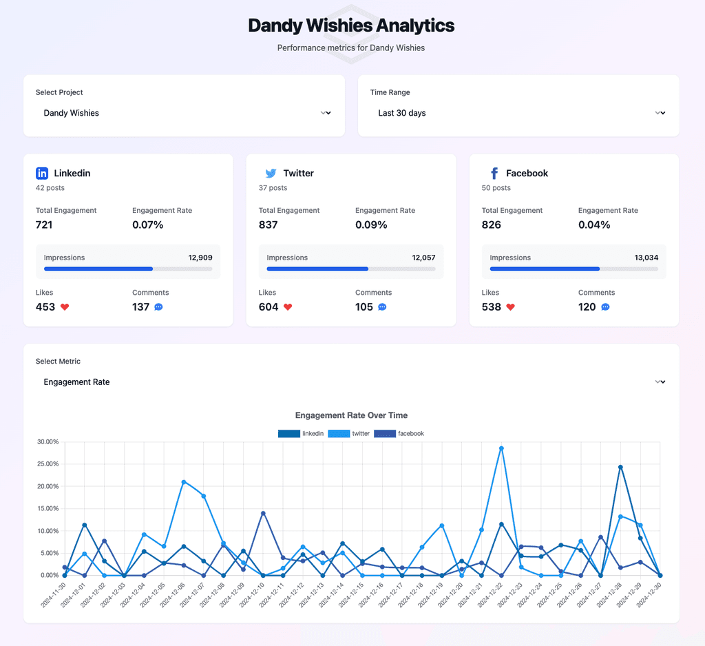 Track engagement across all platforms with detailed metrics and visualizations. Monitor your social media performance in real-time.