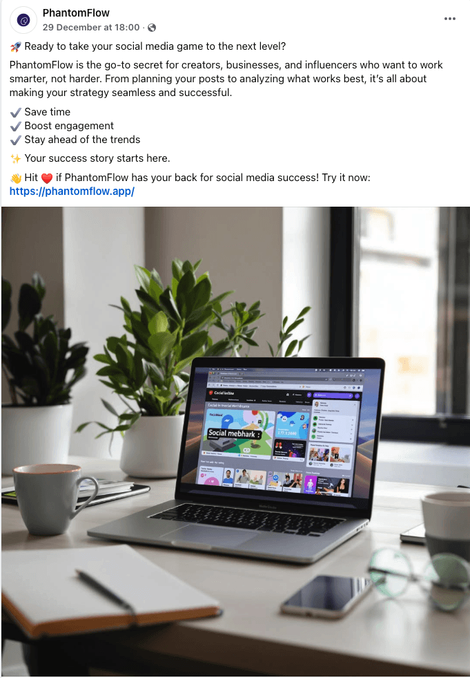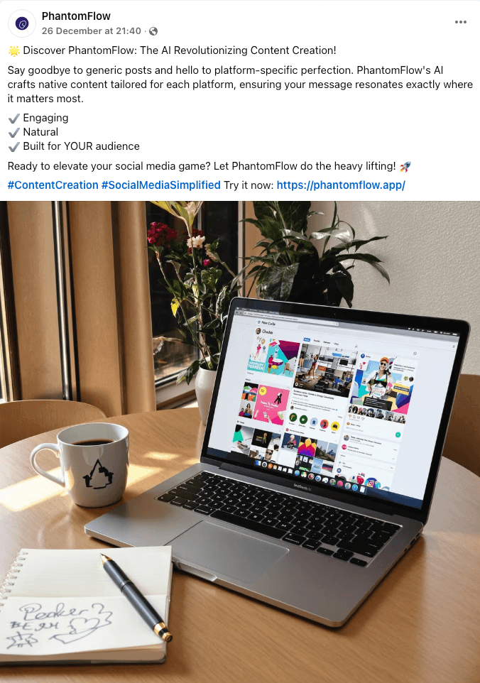 From engaging visuals to compelling copy, see how PhantomFlow creates platform-perfect posts automatically